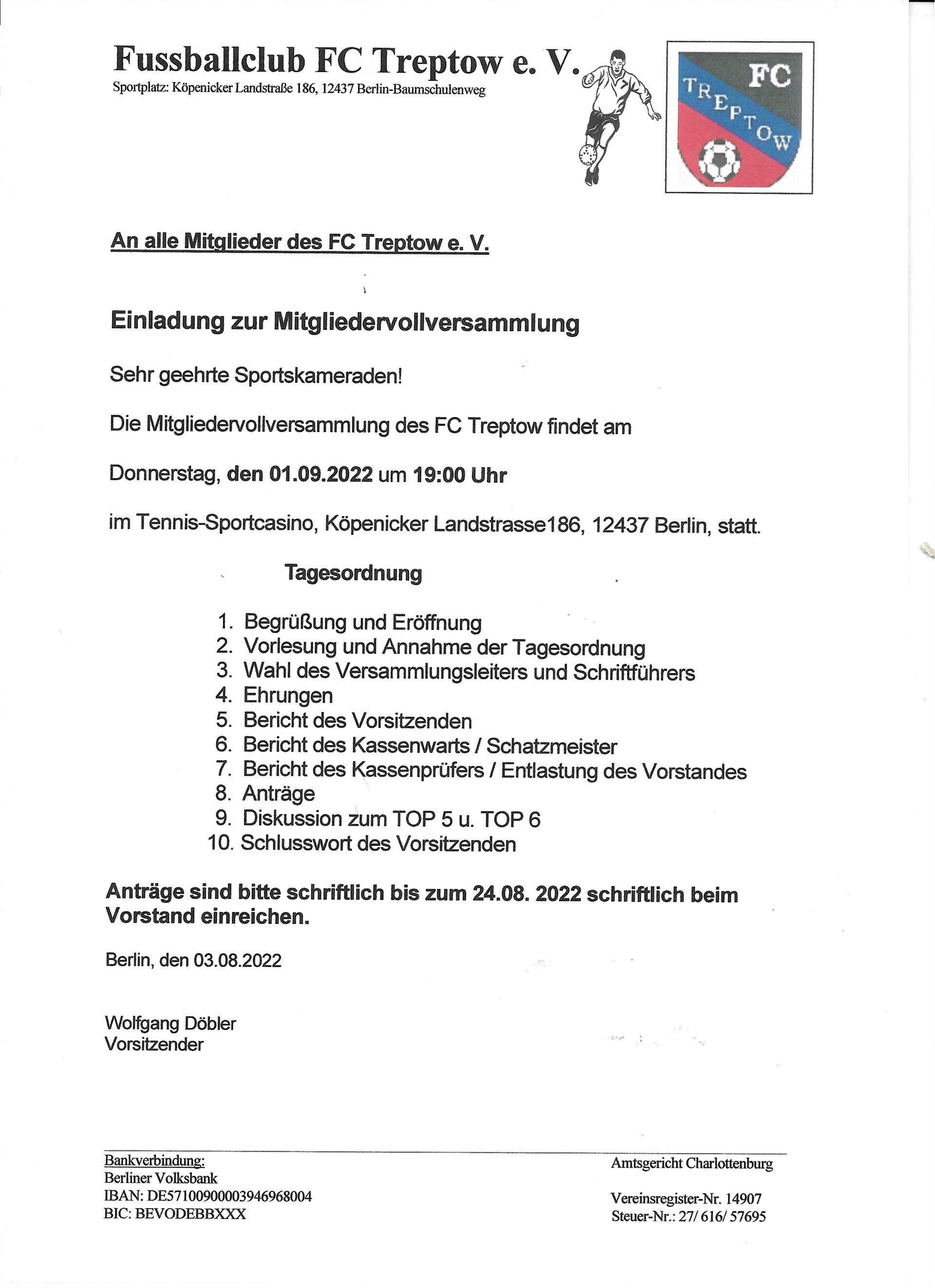 Todos los miembros del FC Treptow y sus invitados están amablemente invitados a la asamblea general anual de este año.