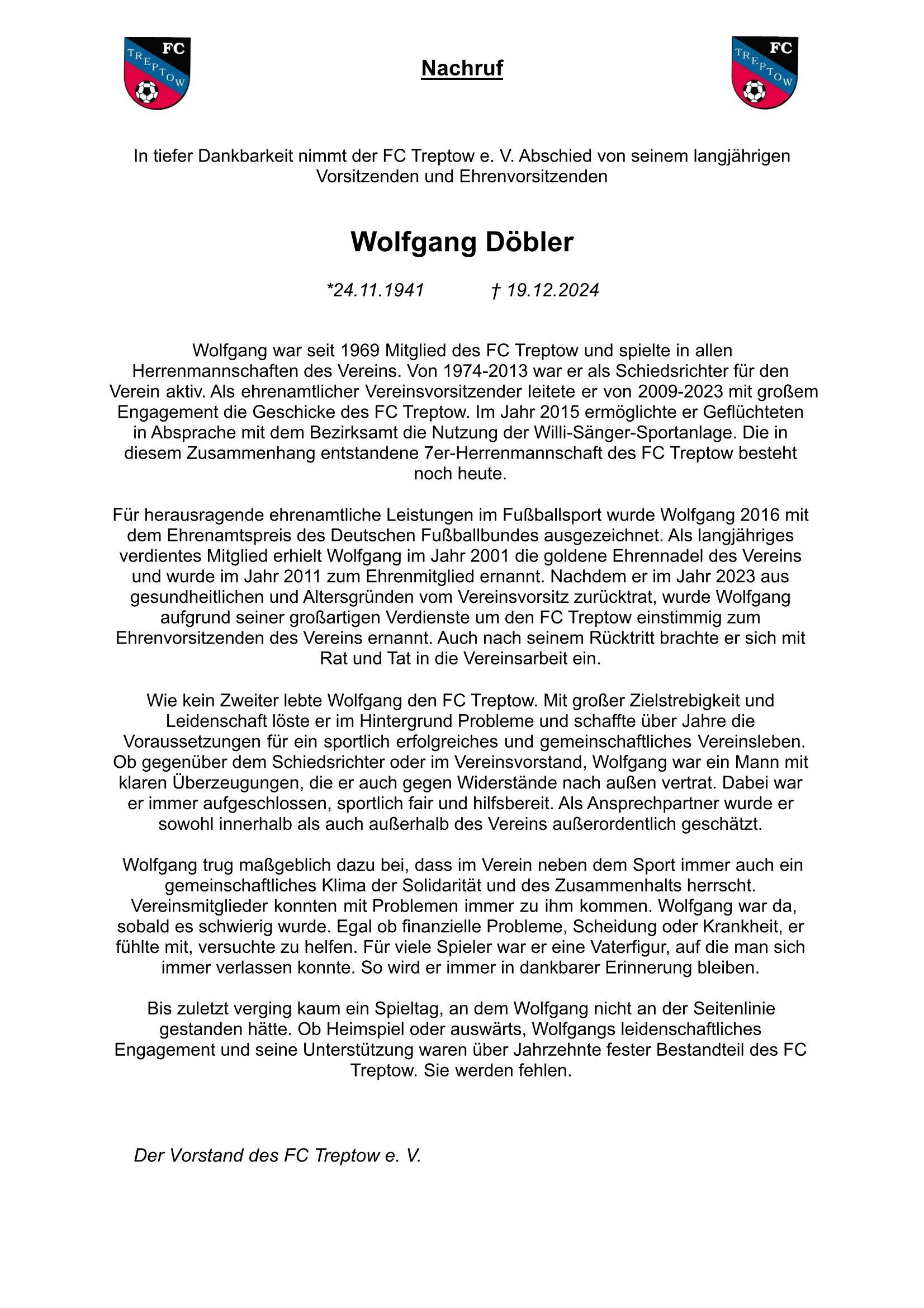 Wir nehmen Abschied von Konrad Wich, der am 10.09.2025 im Alter von 84 Jahren verstorben ist. Seit 1967 war er Vereinsmitglied, spielte lange bei den Senioren und engagierte sich als Kassenwart von 2009 bis 2023 beim FC Treptow. Er erhielt die goldene Ehrennadel und wurde 2018 mit dem DFB-Ehrenamtspreis ausgezeichnet.