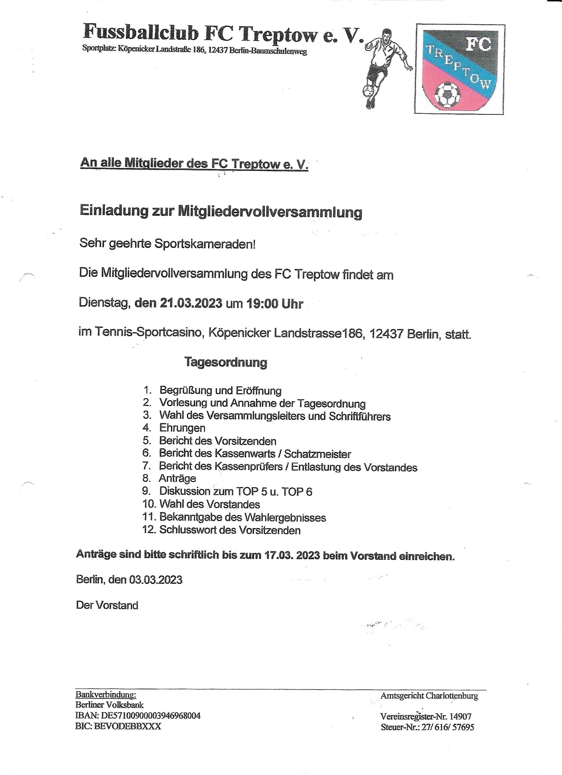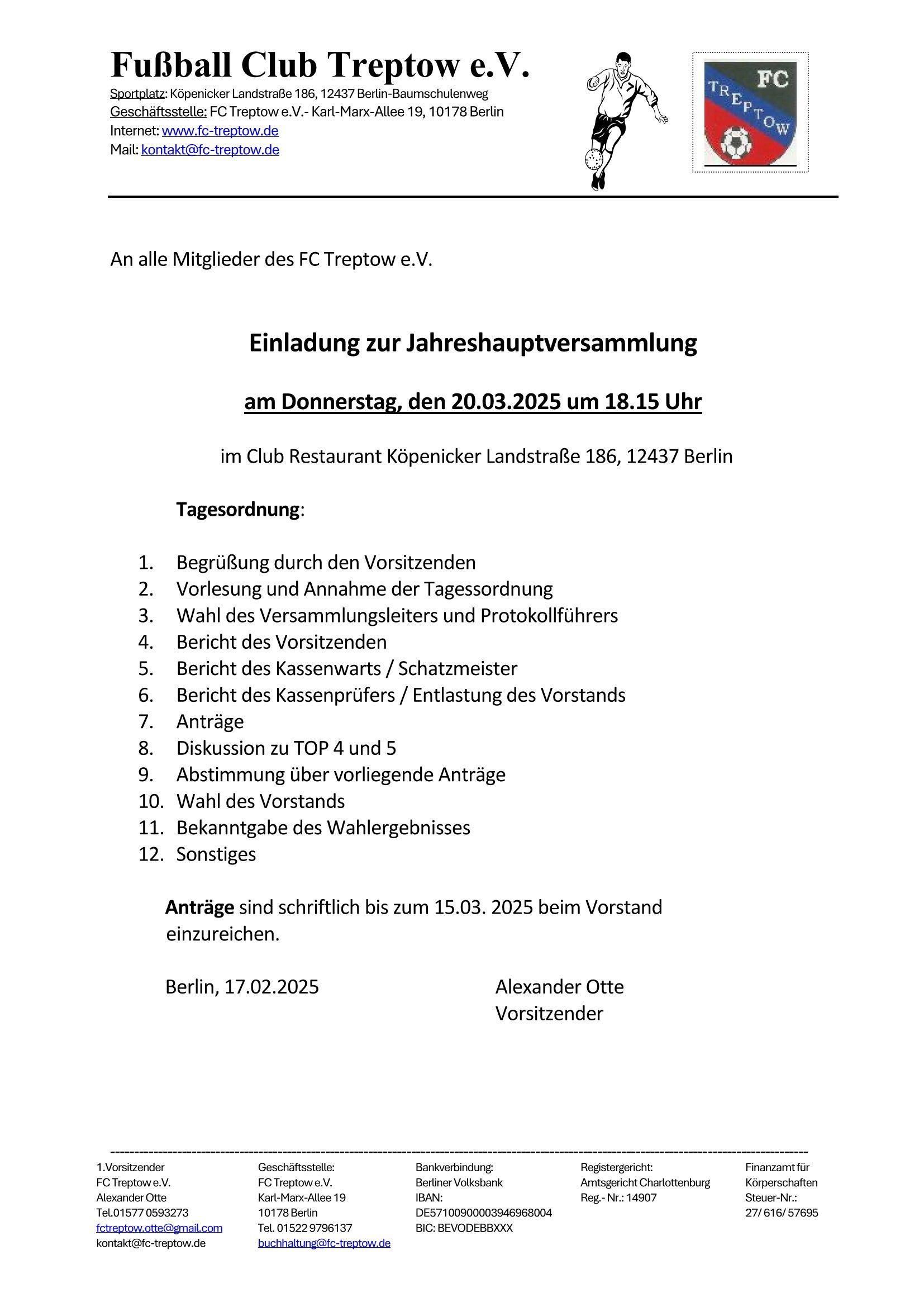 Alle Mitglieder des FC Treptow und Gäste werden zur diesjährigen Jahreshauptversammlung freundlichst eingeladen.